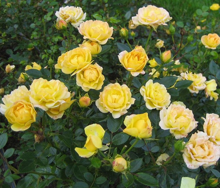 Цветки Yellow Fairy имеют насыщенный желтый цвет, который со временем может слегка выгорать до кремового оттенка, создавая интересные цветовые переходы. Диаметр цветков составляет около 3-4 см, они собраны в густые соцветия, что придает кусту пышный и нарядный вид.